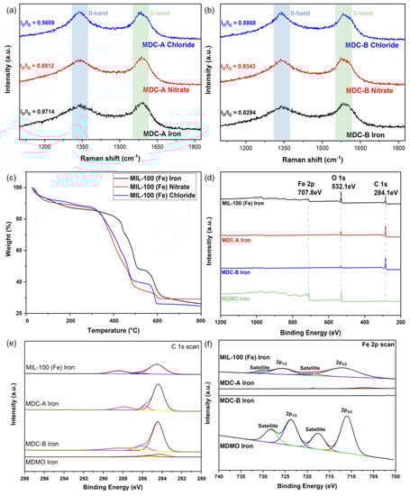 Raman spectra of MDC-A (a), MDC-B (b); TGA data of MIL-100 (Fe) iron, nitrate, chloride (c); Wide-scan XPS (d), C 1s (e) and Fe 2p spectra (f) of MIL-100(Fe) iron, MDC-A, MDC-B, and MDMO.