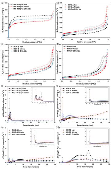 Nitrogen adsorption-desorption isotherm of MIL-100 (Fe) (a), MDC-A (b), MDC-B (c), MDMO (d); pore size distribution of MIL-100 (Fe) (e), MDC-A (f), MDC-B (g), MDMO (h).