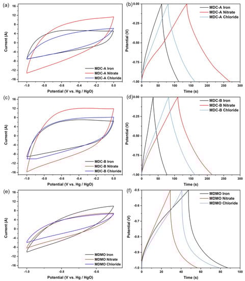 The as-obtained MIL-100 (Fe)-derived carbon (MDC) and metal oxide (MDMO) were investigated as potential supercapacitor electrode material. The three-electrode system used an aqueous 6 M KOH as the electrolyte and conducted cyclic voltammetry (CV) and galvanostatic charge-discharge (GCD) tests to methodically study the electrochemical performances of two types of MDCs and MDMO electrodes. The potential ranges of −1.0 to 0.0 V and −1.0 to −0.5 V (vs. Hg/HgO) were used to test the CV investigations for the electrodes based on MDC and MDMO, respectively. The capacitive characteristics of two MDCs and an MDMO at the scan rate 200 mVs−1 are shown in Figure 6a,c,e (Figure S2 shows various scan rates from 5 to 200 mVs−1). The CV curves of MDC-A, MDC-B, and MDMO exhibit symmetry shapes. They can be maintained at a high scan rate 200 mVs−1 without noticeably changing or distorting, demonstrating their exceptional rate capacity. This excellent rate performance is attributed to its many mesopores, which are produced from the unique MOF structure and enable the transport of electrolyte ions in the pore channels [8]. In the case of MDMO-based electrodes, Figure 6e makes it abundantly clear that none of the three different MDMOs exhibit a pair of glaring redox peaks, as reported by earlier studies [53,54]. Similar phenomena happen when the materials are calcined, and α-Fe2O3 is formed on their surface.