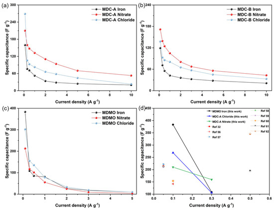 Figure 7a–c shows the mass-specific capacitance derived from GCD curves using Equation (1) at various current densities. This figure shows the individual capacitances for MDC-A, MDC-B, and MDMO. For porous carbon electrode, MDC-A derived from the MIL-100 (Fe) nitrate precursor has the most significant specific capacitances 210.1, 159.6, and 139.1 Fg−1 at current densities 0.1, 0.3, and 10 Ag−1, respectively. The highest specific capacitance for metal oxide electrode is displayed by MDMO iron, which is 383.1 Fg−1 at 0.1 Ag−1 and Fg−1 at 0.1 Ag−1. At low current densities, MDMC has a higher capacitance than MDC-A and MDC-B. These capacitances at each corresponding current density are almost higher than those of the derived materials using MOF as precursors in the literature (Figure 7d) [32,56,57,58,59,60,61,62].