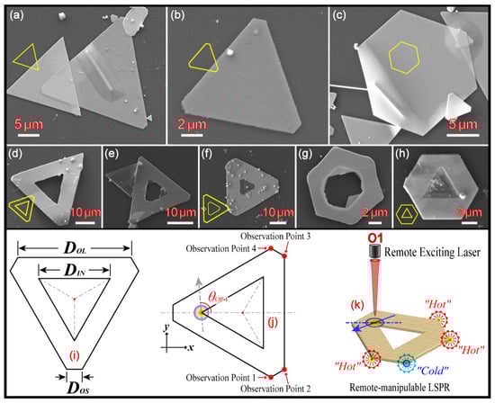 Most recently, Chen et al. reported a simple two-step approach [,,,], which could synthesize two-dimensional HGNSs, as shown in Figure 1d–h. HGNS could grow epitaxially from a solid gold nanosheet (SGNS, as shown in Figure 1a–c and Figure S1a–c) in the liquid phase, and it commonly contains a regular or irregular hollow cavity formed concentrically in the center of itself (see Figure 1d–h). The shapes for the center cavity and the outer solid sheet could be either homotype or heterotype (see Figure 1d–h) [,]. In fact, there are more heterotype HGNSs among the reaction outcomes (Figure 1e–h). The outline of these HGNSs is normally hexagonal, including two types: regular hexagon or irregular hexagon. The irregular hexagon has three long sides and three short sides cross-linked alternatively. If it is combined with a triangle cavity in the center, a H–T heterotype HGNS is then achieved (as shown in the sketch maps in Figure 1i–k). In this paper, the studies are focused on the polarization-dependent anisotropic properties of those H–T heterotype HGNSs, because, compared with T–T homotype HGNSs, the symmetry of the structure has been destroyed one step further. This breaking of the symmetry is of great benefit to enhance the optical anisotropic properties of HGNSs, and the latter (optical anisotropy) is the foundation for HGNSs to be utilized as polarization-dependent waveguide switches []. Therefore, the remote excitation and controlling of SPPs and LSPR among four coupled hotspots (i.e., the four remote vertexes of the outer hexagon) were systematically evaluated using FDTD simulations.