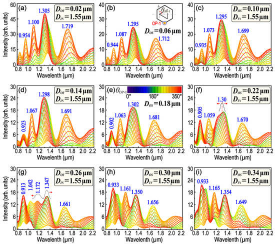 In a given metallic nanostructure, the LSPR and resonance wavelength are dependent on many factors such as the structure size, symmetry, surface morphology, etc. Among these factors, the structure symmetry is sensitive to the polarization of the exciting light. Therefore, in order to clarify the interactions between the structure symmetry and exciting light polarization and also to clarify how these interactions affect the remote-excited SPPs and LSPR, the polarization-dependent LSPR spectra of H–T HGNS were firstly and systematically calculated. The size of DOS varies from 0.02 μm to 0.70 μm, whereas the total length of six sides of the outer hexagon is kept constant to 6.0 μm. Thus, DOL will vary along with the variation in DOS. Except for a few special cases, the size of the center triangle is also kept unchanged (DIN = 1.55 μm). It must be pointed out that in order to obtain desirable results in some special cases, we sometimes need to optimize some parameters appropriately. In these cases, DIN is slightly adjusted according to the practical requirements. Figure 2 and Figure 3 are the polarization-dependent LSPR spectra obtained from OP1, while DOS is within the range of 0.02–0.34 μm and 0.38–0.70 μm, respectively. The spectra are convenient for us to trace the position of each LSPR peak and its dependence on θOP-i as well as DOS. When DOS is smaller than 0.22 μm, four obvious LSPR peaks could be observed around the wavelength of 0.95, 1.10, 1.30 and 1.70 μm, respectively. With the increase in DOS, the variation in the LSPR peak position is not simply red-shift or blue-shift, because some of the main LSPR peaks will be split into more subpeaks, or conversely, some subpeaks will also be able to merge into one main peak. For example, the peak-splitting begins when DOS is larger than 0.22 μm for the LSPR peak around the wavelength of 1.30 μm (see Figure 2e–g and Figure S2a–c). When DOS reaches 0.26 μm, the LSPR peak initially around 1.30 μm has been split into two subpeaks, of which one is centered at 1.172 μm and the other is centered at 1.347 μm (see Figure 2g and Figure S2c). On the contrary, when DOS increases from 0.26 to 0.46 μm, two LSPR subpeaks, which are around 0.913 and 1.042 μm, respectively, will be merged into one peak firstly, and then split apart again (see Figure 2g–i and Figure 3a–c). Therefore, it is difficult to judge the shift of these LSPR peaks when DOS is just varied within this range (0.26–0.46 μm). The result is not surprising, because although the length of DOS is increased, the total length of the outer hexagon (6.0 μm) has not been changed, which means that DOL will be subsequently decreased.
