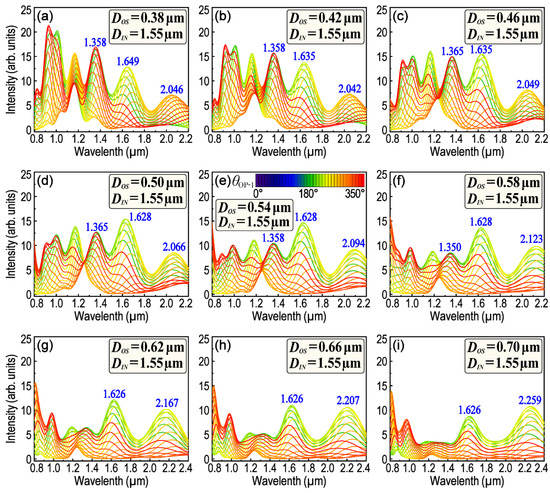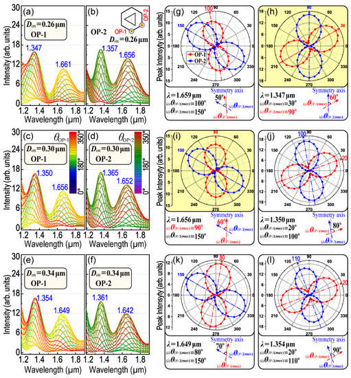 First, one of (λ)θOP-i(max) is equal to 90°, which means that considering the structure symmetry, as for two symmetrical OPs, the polar plot of the peak intensity as a function of θOP-i will be almost overlapped. For example, OP1 and OP4 (also OP2 and OP3) are symmetrical with respect to the x-axis (see Figure 1j). With respect to the same axis, the polar plot for θOP-1 will be symmetrical to that of θOP-4 as well. Thus, when (λ)θOP-i(max) is equal to 90°, the polarization curves in the polar plot for two corresponding and symmetric OPs will be overlapped and their polarization properties will be mirrored with the x-axis. There are two polarization angles equal to 90°, respectively, in Figure 6d,g. The first one is relevant to OP2 (as shown in Figure 6d, DOS = 0.26 μm, λ = 1.347 μm), while the second is relevant to OP1 (as shown in Figure 6g, DOS = 0.30 μm, λ = 1.656 μm).