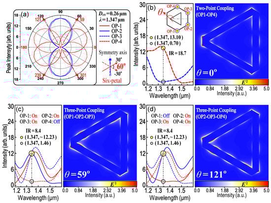 Remote-controlling of LSPR among OP1–OP4. (a) A six-petal polar plot. DOS = 0.26 μm, λ = 1.347 μm; (b) Two-point coupling between OP1 and OP4; (c,d) Three-point coupling in OP1–OP2–OP3 and OP2–OP3–OP4.