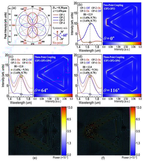 Symmetrical and complementary results with those in Figure 7. (a) A six-petal patterned polar plot. DOS = 0.30 μm, λ = 1.656 μm; (b) Two-point coupling between OP2 and OP3; (c,d) Three-point coupling in OP1–OP3–OP4 and OP1–OP2–OP4; (e,f) Mapping of Poynting vectors (θ = 0° and θ = 64°).