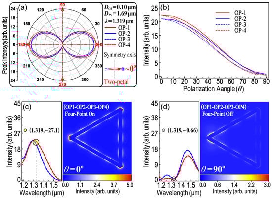 Finally, a two-petal patterned polar plot was achieved while λ = 1.319 μm, DOS = 0.10 μm and DIN = 1.69 μm. As shown in Figure 10, the main feature of this two-petal plot is that four curves for all OPs are almost overlapped. Thus, the intensity of the LEF at OP1–OP4 is almost equivalent no matter how many degrees the polarization angle (θ) is. Figure 10b shows the dependence between the LEF intensity and incident polarization (θ). The result means that the LEF intensity at four OPs could be controlled and regulated at the same time by tuning θ. When θ = 0°, the LEF intensity obtains its maximum value and LSPR turns on simultaneously at all OPs (as shown in Figure 10c). However, when θ = 90°, four-point on-off switching of LSPR was then obtained (see Figure 10d). Therefore, in addition to two-point coupling and three-point coupling, a group of parameters is now discovered which is suitable for four-point on/off switching of LSPR.