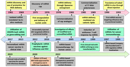 Historical evolution of the different stages of RNA development and its therapeutic applications from the mRNA discovery in 1961 to the development of mRNA therapies in 2022. Reproduced from [29].