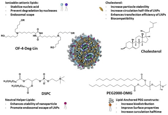 Description of the mRNA-based lipid nanoparticle general structure and their basic components together with their main characteristics. Reproduced from [41,42].