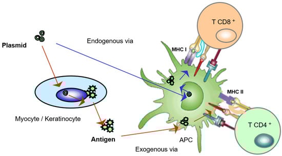 Mechanisms of activation of an antigen presenting cell through a DNA vaccine. This activation can be either directly (endogenous via) or through an intermediate cell that captures the plasmid and produces the pathogen antigen that will be recognized by the APC (exogenous via).