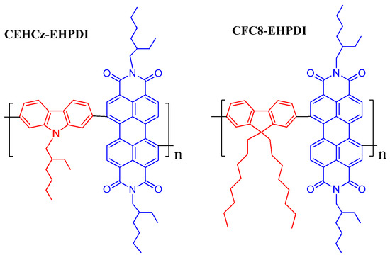 Chemical structures of the donor-acceptor (D-A) copolymers with various donor units: poly[N,N′-bis(2-ethylhexyl)perylene-3,4,9,10-tetracarboxydiimide-1,7-diyl-alt-9-(2-ethylhexyl)carbazole-2,7-diyl]s (CEHCz-EHPDI) and poly[N,N′-bis(2-ethylhexyl)perylene-3,4,9,10-tetracarboxydiimide-1,7-diyl-alt-9,9-dioctylfluorene-2,7-diyl]s (CFC8-EHPDI). The electron-donor (D) and electron-acceptor (A) units are shown in red and blue, respectively.