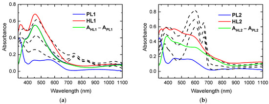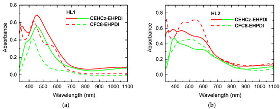 Absorption spectra of CEHCz-EHPDI pristine (PL1, PL2—blue) layers and hybrid (HL1, HL2—red) layers prepared at (a) –1 V (HL1) and (b) –1.5 V (HL2) vs. Ag/Ag+ corresponding to the first and second reduction processes, respectively. Absorption spectra as measured during Ag doping are also displayed (black dashed). Difference spectra (difference in the absorbance (A) of hybrid AHL and pristine APL layers: Adif = AHL − APL) are displayed by green curves.