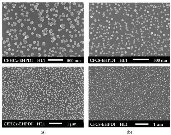 where d0 is the mean diameter and is the distribution parameter. The evaluated parameters d0 and are given in Table 1. The normal distribution functions are displayed in Figure 6, where the comparison for the copolymers CEHCz-EHPDI with 9-(2-ethylhexyl)carbazole and CFC8-EHPDI with 9,9-dioctylfluorene D unit is shown. These SEM results correlate well with the absorption spectra. They explain the above-mentioned red shifts of the HL1 absorption spectra and the blue shifts of the HL2 absorption spectra of CEHCz-EHPDI copolymer compared to the corresponding HL1 and HL2 absorption spectra of CFC8-EHPDI copolymer. An aggregation of Ag-NPs into chain-like structures appeared in HL2 layers with high surface coverage, which is in accord with the broad HL2 absorption spectra. These results are consistent with surface plasmon theory [56].