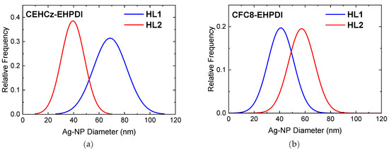 The Ag-NP sizes (diameters) differ for the HL1 and HL2 layers, i.e., layers prepared under different conditions, and also for the copolymers under study. For CEHCz-EHPDI hybrid layers, larger diameters are observed for the HL1 layers than for the HL2 layers. This is the opposite result when compared with the CFC8-EHPDI hybrid layers, where Ag-NPs with larger diameters are formed in the HL2 layers than in the HL1 layers. The SEM analysis using Image J provided histograms of the Ag-NP diameters, which were fitted with the normal distribution function (Gaussian) given by the general formula for the probability function f(x) expressed: