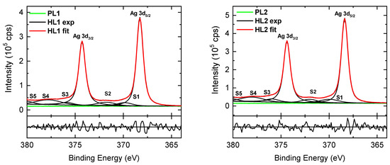 The Ag-NP metallic state was further confirmed by analysis of the HR spectra. The modeling of HR C 1s, Ag 3d, N 1s, and O 1s spectra was performed using the Voigt profile. The residual standard deviation value, which was <1.17, was used to check the goodness of fit. Normalized residuals are displayed below the spectra. The fit goodness was also indicated by the residuals to the fit and Monte Carlo-based error analysis. An example of HR Ag 3d spectra for CEHCz-EHPDI layer surfaces is shown in Figure 8. The characteristic peaks correspond to Ag 3d5/2–Ag 3d3/2 spin-orbit components. The peak separation of 6 eV is in good agreement with the spin-orbit splitting separation value for metallic Ag [69]. In the Ag 3d spectra of the corresponding PL layers, no peaks indicating any Ag presence were found. The Ag 3d5/2 peak positions (BEs) in the Ag 3d spectra of the hybrid layers are in good agreement or slightly up-shifted (<0.1 eV) compared with the Ag 3d5/2 BE value of 368.28 eV for the metallic Ag. The most pronounced up-shifts were observed for the HL2 layers with the highest coverages and could be explained by charge redistribution at the surface and interface [70]. The explanation of the slight BE up-shifts was also supported by the AP values. The HR Ag 3d spectra were deconvoluted into two Ag 3d5/2 and Ag 3d3/2 main components and additional symmetrical lines corresponding to the satellites analogously to the metallic Ag spectrum. The HR Ag 3d spectra of CEHCz-EHPDI hybrid layer surfaces exhibited similar features as the HR Ag 3d spectra of CFC8-EHPDI hybrid layer surfaces, which are analyzed in detail in our previous work [21]. The satellites S1 and S3, which are separated by ca. 1.5 eV relative to the main Ag 3d5/2 and Ag 3d3/2 peaks, respectively, can be interpreted as an emission process associated with an atomic-like pure p-screening. The S2 and S4 satellites, separated by ca. 3.5 eV relative to Ag 3d5/2 and Ag 3d3/2 BEs, respectively, are associated with the plasmon loss features. The S5 satellite separated ca. 12 eV from Ag 3d5/2 BE, which corresponds to the 4d → 5p shake-up [71,72,73].