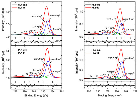 The HR C 1s spectra of the CEHCz-EHPDI layers, which are displayed in Figure 9, were deconvoluted into 5 components corresponding to aromatic C sp2, aliphatic C sp3, C–N sp2, C–N sp3, and C=O groups, and π-π* satellite components, which typically appear in the XPS spectra of aromatic compounds. In the HR spectra of the PL layers, the component peak maxima are located at 284.9 eV (aromatic C sp2), 285.3 eV (aliphatic C sp3), 285.8 eV (C–N sp2), 286.3 eV (C–N sp3), and 288.4 eV (O=C–N), which is in good agreement with the data reported in the literature [74,75,76]. The peak assigned to the shake-up excitations associated with the aromatic C sp2 is located at approximately 287.3 eV, which also agrees well with that observed in the spectra of PDI derivatives [77,78]. The other weaker peaks at higher BEs are associated with shake-up phenomena—π-π* satellite peaks of C=O and aromatic C sp2 [76,77,78,79]. A decrease in the main peak area and an increase in the satellite/main peak area ratios are observed in the spectra of the hybrid layers, similar to the HR C 1s spectra of CFC8-EHPDI HL layers as analyzed in detail in our previous work [21].