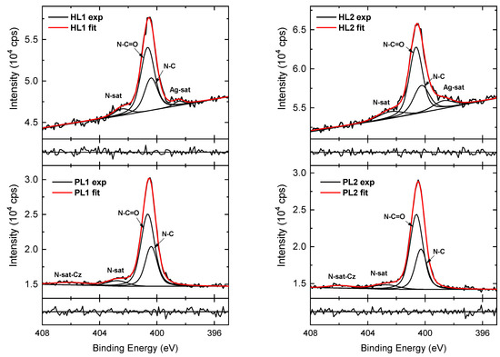 The HR N 1s spectra of the PL layers of the CEHCz-EHPDI copolymer are displayed in Figure 10. They have to be modeled with four components. Compared to modeling the CFC8-EHPDI spectra, two additional components are required due to the N atom in the carbazole unit. The components with maxima at 400.3 and 400.6 eV are assigned to N–C in carbazole D units and N–C=O in PDI A units, respectively [76]. The smaller peaks at higher BE of approximately 403 and 406 eV represent π-π* satellite features of PDI and carbazole units, respectively, which are characteristic of nitrogen-containing aromatic polymers. In the HR N 1s spectra of the hybrid layers, the components corresponding to the C–N and N–C=O groups also dominate, but the intensity of both peaks decreased compared with that in the spectra of the corresponding PL layers. An additional component at a lower BE in the N 1s energy region, which is influenced by the Ag 3d photoelectron losses, can be assigned to the Ag 3d core line satellite (bulk plasmon) [71]. The contribution of the satellite component increases with increasing Ag 3d doublet peaks, i.e., it is higher in HL2 layers with higher Ag-NP coverages than in HL1 layers.