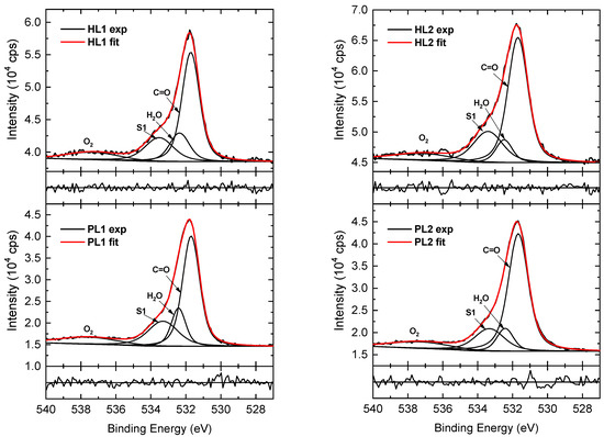 High-resolution O 1s spectra of CEHCz-EHPDI pristine (PL1, PL2) and hybrid (HL1, HL2) layer surfaces, including components. Normalized residuals are shown below the spectra.
