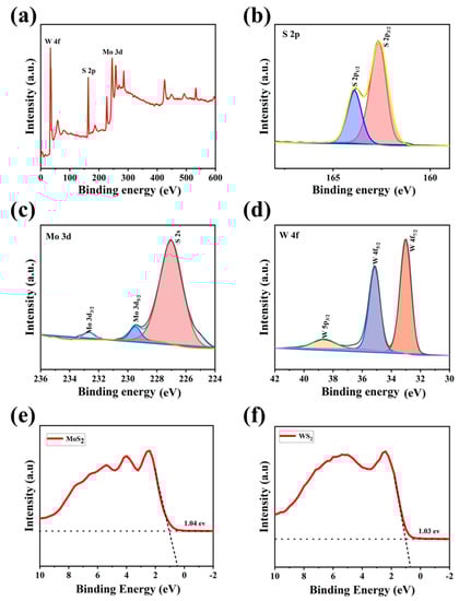 The XPS spectra of the 5 MW sample: (a) the survey spectrum, (b) high-resolution S 2p, (c) high-resolution Mo 3d, (d) high-resolution W 4f of the 5 MW sample, and (e,f) the VB-XPS spectra of MoS2 and WS2.