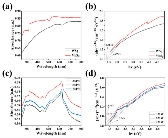 (a,c) The UV-Vis absorption spectra of the WS2, MoS2, 3 MW, 5 MW, and 7 MW samples. (b,d) Tauc plots showing the band gaps of the WS2, MoS2, 3 MW, 5 MW, and 7 MW samples.
