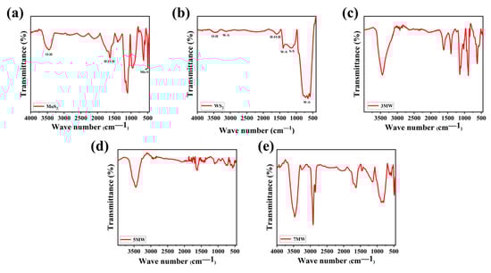 The FT-IR spectra of the (a) MoS2, (b) WS2, (c) 3 MW, (d) 5 MW, (e) 7 MW samples.