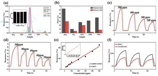 (a) Selectivity of MoS2, WS2, and composite samples for different gases of 500 ppm at room temperature. (b) Response and recovery time of the 5 MW-based gas sensor to 500 ppm NH3 at room temperature. (c,d) Responses of the 5 MW sample to different concentrations of NH3 at room temperature. (e) Linear response of the 5 MW sensor to varying concentrations of NH3. (f) Long-term stability of the 5 MW sensor for six months.