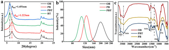 XRD was used to analyze the structures of OB, PB, PBT, and BT. The results are shown in Figure 1a. The d001 of PBT was reduced from 1.451 nm to 1.223 nm as compared to OB, which contributed to the quaternary amino via ion exchange in betaine. The bentonite layer distance of d001 was not significantly affected by a betaine content above 5% (Figure S1). The particle sizes of OB, PB, and PBT dispersed in water are shown in Figure 1b. PBT displayed nanodispersibility after modification, with the particle size dropping from 203 nm for OB to 106 nm, due to the intercalation of betaine. The IR of bentonite is shown in Figure 1c, where the main spectral bands of bentonite are 3623 cm−1, attributed to the stretching vibration of montmorillonite structural hydroxyl −OH, 3436 cm−1, and 1636 cm−1, mainly due to the stretching vibration of an interlayer water molecule −OH and bending vibration of −OH, 1421 cm−1 attributed to the stretching vibration and bending vibration of C-H, 1034 cm−1 and 797 cm−1 attributed to the stretching vibration and bending vibration of Si-O, and 876 cm−1 attributed to the bending vibration of montmorillonite structural hydroxyl −OH. In particular, the peak at 1564 cm−1 was the stretching vibration of acrylate (−COO−) on both PB and PBT, and the peak at 1339 cm−1 was the stretching vibration of C-N on PBT.