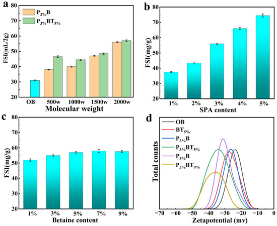 (a) The FSI of OB, P3%B, and P3%BT5% with different molecular weights of SPA; (b) the FSI of PBT5% with different SPA (2000 w) content; (c) the FSI of P3%&2000wBT with different betaine content; and (d) the zetapotential of OB and PB with different SPA contents and PBT with different SPA and betaine contents.