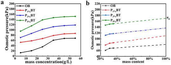 (a) Osmotic pressure of OB, P1%BT, P3%BT, and P5%BT colloidal at different mass concentrations; (b) linear extrapolation of osmotic pressure based on bentonite mass content.
