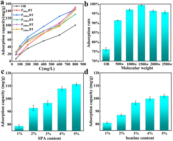 (a) The methylene blue adsorption capacity of P3%BT5% with different SPA molecular weights; (b) the methylene blue adsorption rate of P3%BT5% with different SPA molecular weights; (c) the methylene blue adsorption capacity of P2000 wBT5% with different SPA contents; and (d) the methylene blue adsorption capacity of P2000wBT5% with different betaine contents.