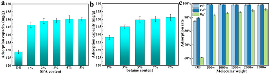 (a) The Pb2+ adsorption capacity of P2000wBT5% with different SPA contents; (b) the Pb2+ adsorption capacity of P3%&2000wBT with different betaine contents; and (c) the Pb2+, Cd2+ and Hg+ adsorption rates of OB and P3%BT5% with different SPA molecular weights.