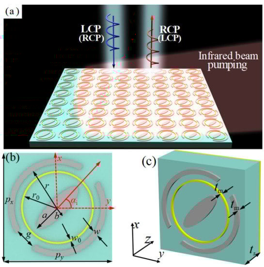The electric conductivity of the photoconductive Si is usually proportional to the pumping power of the incident infrared light [,]. For example, the conductivity of the photoconductive Si is only about 1 S/m without infrared pumping (power is zero), while the one is about 1.5 × 105 S/m under the upper-limiting infrared pumping (central wavelength of 800 nm and power is about 405 mJ/cm2) [,,]. As shown in Figure 1a, an excess carrier density will be generated as long as the pumping energy exceeds the band-gap energy of the photoconductive Si when an infrared beam is illuminated on the designed MS [,]. In this case, the hybrid structures of the photoconductive Si array are in the metal state. While without infrared illumination, the hybrid structures of the photoconductive Si are in the insulation state. Note that the entire area of the designed MS is fully covered by the infrared beam (see Figure 1a).