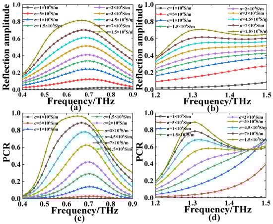 The (a,b) reflection amplitude of the orthogonal CP wave and (c,d) the PCR at the (a,c) lower and (b,d) higher frequency regions for the proposed MS with different conductivity of photoconductive Si (from σsi = 1 S/m to σsi = 1.5 × 105 S/m).