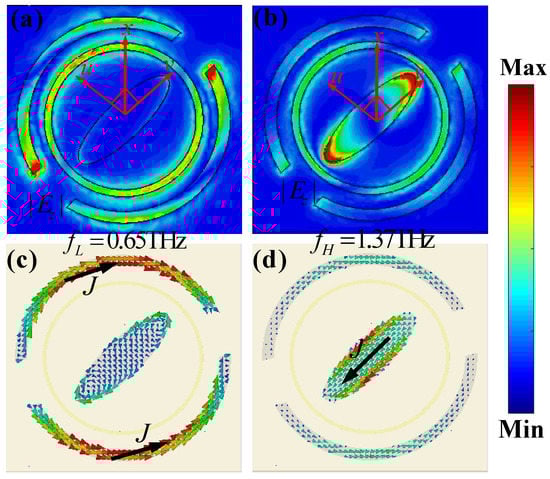 Since both the outer CDSR and inner ESP structures are assumed as the evolved metal cut-wire structure resonators, thus, a similar electric response can be observed at the two distinct frequencies. As shown in Figure 3a,b, the induced z-component of the electric field (|Ez|) is mainly focused and distributed on the outer Si CDSR structure at the 0.65 THz, while the one is on the inner Si ESP structure at 1.37 THz. It means that the outer CDSR structure corresponds to the resonance response of the lower frequency, while the inner ESP structure to the one of the higher frequency. The electric fields of both the incident and the reflected CP waves are decomposed into two orthogonal components, i.e., u-component and v-component, respectively. The eigenmode resonances on the Si ESP and CDSR structures can be excited with electric components along the u- and v-axis directions, respectively. The excited dipole of the Si ESP and CDSR partly couples to the dipole mode on the interface of the top layer and air, leading to cross-polarization conversion after reflection. Obviously, the |Ez| distributions on the Si ESP and CDSR structures reveal effective excitation of the surface plasmon polaritons (SPPs) at resonances. As shown in Figure 3c,d, at the lower frequency of 0.65 THz, the induced surface current is mainly distributed on the upper and down edges of the outer CDSR structure, while the one is on the left-up and right-down edges of the part inner ESP structure at the higher frequency of 1.37 THz, which are both consistent well with the induced electric-field distributions along the v-axis direction, revealing strong electric dipolar resonance responses of the unit-cell structure for the normal incident LCP wave. Note that nearly no surface current distributions can be observed on the middle metal CR structure at the above two distinct frequencies. These electric-field and surface-current distributions on the unit cell reveal that the reflective CP conversion of the designed structure mainly originates from the fundamental dipolar resonance and structure anisotropy, showing that the respective control at two independent frequency regions is available.