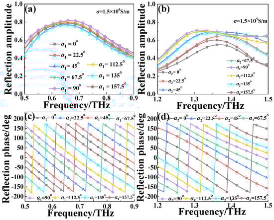 To achieve the efficient reflective beam deflection effect for the CP wave, the full 2π phase coverage should be satisfied at the two distinct frequency ranges by rotating the αi (i = 1, 2) based on the PB phase principle instead of changing the structure parameter of the MS. Figure 4 presents the reflection amplitude and phase of the orthogonal CP wave of the proposed structure with different rotation angles (α1 and α2) under the upper infrared pump power (σsi = 1.5 × 105 S/m). As shown in Figure 4a,c, at the lower frequency range of 0.5–0.9 THz, the designed MS exhibits a linear gradient phase of the reflected orthogonal CP wave when rotating the α1 of the outer CDSR structure by a step of 22.5° from 0° to 157.5°, while the corresponding amplitude is nearly unchanged. As shown in Figure 4b,d, at the higher frequency range of 1.2–1.5 THz, similar results for the reflection amplitude and phase also can be obtained by rotating the α2 of the inner ESP structure by a step of 22.5° from 0° to 157.5°. Obviously, the reflection amplitude of the orthogonal CP wave through the MS is very high and the corresponding phase is varied linearly with a certain interval by changing the α1 and α2. It means that the orthogonal reflection phase can realize the full coverage from 0 to 2π by respectively changing the α1 and α2 from 0° to 180° at the two independent frequency regions.