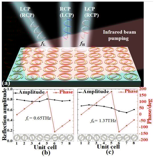 In the flowing section, we will study the THz beam deflection effect for the proposed MS based on the PB phase principle under infrared illumination with different pumping power. Here, as shown in Figure 5a, a supercell comprised of eight unit cells with different α1 and α2 has been designed to guarantee that the linear phase gradient from 0 to 2π with high efficiency can be achieved at two different frequency ranges. As shown in Figure 5b,c, when the designed supercell is illuminated by the infrared with upper pumping power (σsi = 1.5 × 105 S/m) at fL/fH = 0.65/1.37 THz, the rotating angles α1/α2 of eight unit cells are 0°/−0.9°, 45°/45°, 90°/90°, 135°/135°, 178°/179°, −134°/−136°, −89°/−89°, and −46°/−44°, respectively. Obviously, the designed MS supercell exhibits a discontinued phase shift with nearly a step of 45° at 0.65 THz and 1.37 THz, respectively. In addition, as illustrated in Figure 5b,c, all reflection amplitudes for the selected eight unit cells of the designed supercell are about 0.8 and 0.65 on average at 0.65 THz and 1.37 THz, respectively, which is favorable to achieve the highly efficient beam deflection effect. By introducing a linear phase gradient, it is expected that the designed MS supercell can realize a THz beam deflection effect with continuous tunable efficiency under different infrared pumping power.