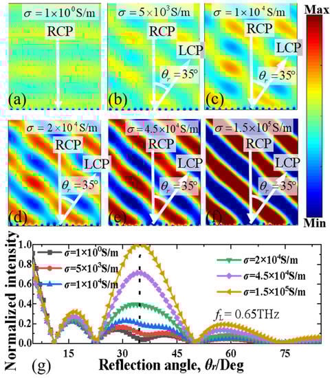 Figure 6 and Figure 7 present the deflected electric field (|E|) distributions and corresponding normalized intensity of the orthogonal CP wave of the proposed MS supercell with different conductivity of photoconductive Si (σsi = 1 S/m, 5 × 103 S/m, 1 × 104 S/m, 2 × 104 S/m, 4.5 × 104 S/m, 1.5 × 105 S/m) at 0.65 THz and 1.37 THz, respectively. The electric conductivity of photoconductive Si can be adjusted easily by changing the infrared pumping illumination power [,,,,]. It is evident that the spatial deflection of the electric field results in the same reflective deflection angle at the same frequency but the corresponding normalized intensity decreases gradually when the electric conductivity of photoconductive Si decreases. As shown in Figure 6a, at 0.65 THz, when the MS with photoconductive Si has electric conductivity σsi = 1 S/m without infrared pumping illumination, the very weak electric field is directly reflected along the vertical direction without deflection. This is because the photoconductive Si is in an isolation state in the case without infrared pumping illumination, and the whole MS functioned as a mirror reflector. As illustrated in Figure 6b–f, when σsi = 1 S/m, 5 × 103 S/m, 1 × 104 S/m, 2 × 104 S/m, 4.5 × 104 S/m and 1.5 × 105 S/m, the photoconductive Si is gradually changed from the isolation to metal state, the reflective deflected electric field distributions will become more and more obvious, and the deflection angle is always kept at about 35°, very close to the theoretical predication value of 35.2°. As depicted in Figure 6g, the normalized intensity of the deflected orthogonal CP wave beam will gradually increase with the increase of the electric conductivity of photoconductive Si. When σsi = 1 S/m without infrared pumping illumination, the normalized intensity of the deflected beam is near zero, which is consistent well with the electric-field distribution. When σsi increases from 5 × 103 S/m to 1.5 × 105 S/m, the normalized intensity of the deflected beam is increased from 0.1 to 1. This means that the efficiency of the deflected beam is highly dependent on the variation of the infrared pumping illumination power.