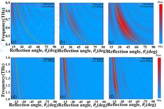 To further illustrate the tunable reflection deflection effect of the designed MS, as shown in Figure 8, we present the simulated and theoretically calculated (dash line) reflection amplitude of the deflected orthogonal CP wave beam as functions of frequency and deflection angles for the designed MS with photoconductive Si of σsi = 1 S/m, 2 × 104 S/m and 1.5 × 105 S/m at the lower and higher frequency regions, respectively. From Figure 8, it is seen that the ordinary reflection (θr = 0°) is practically zero at the lower and higher frequency regions of 0.4–0.9 THz and 1–1.6 THz, and only the deflection CP wave beams are reflected with wide angle ranges of 17°–71° and 13°–23°, respectively, according to the generalized Snell law. Note that the theoretical calculation frequency deflection angles are the same when the designed MS with the photoconductive Si has a different electric conductivity at the same frequency range. It is evident that the frequency-dependent reflection deflection angle calculated using Equation (3) aligns well with the simulation results. From Figure 8a–f, it further confirms that the strength of the reflective deflected electric field will increasingly intensify when the electric conductivity of the photoconductive Si increases at both lower and higher frequency regions.