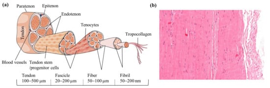 The tendons and ligaments are fibrous, dense, regular connective tissue, allowing for movement and maintenance of body posture. The main functions of tendons and ligaments are to connect and transmit forces from muscles to bones and from one bone to another, respectively. They share a comparable composition and hierarchical structure. The ECM of tendons is composed predominantly of collagen, which accounts for up to 85% of the dry weight of a tendon tissue. Within different types of collagen in tendon ECM, collagen type I represents ~95% of the dry weight, with the rest being collagen type III, V, XI, XII, and XIV. The tendon is composed of two primary cellular components: tenocytes that are fully differentiated cells and account for 90–95% of cellular content in a healthy mature tendons, and tendon stem/progenitor cells that are located within the ECM of the tendon. Additional cellular components include synovial cells located on the surface and vascular cells present in the endotenon and epitenon regions. In normal circumstances, the maintenance and repair of tendons are carried out by tenocytes, but tendon stem/progenitor cells also perform a crucial function in this process by engaging themselves in self-renewal and differentiation into tenocytes [9]. Structurally, a tendon has a well-organized structure with three layers of fibrous bundles: the primary fiber bundle (sub-fascicle) formed from a bunch of collagen fibers, the secondary fiber bundle (fascicle) formed from a group of primary bundles, and the tertiary bundles formed from a bundle of secondary fiber bundles (Figure 2) [10,11]. The diameters of the sub-fascicles and fascicles are dependent on the overall length of the tendon, but small tendons (such as flexor and extensor tendons in the fingers and toes) have smaller sub-fascicles and fascicles, while large tendons (such as the Achilles tendons) have larger sub-fascicles and fascicles. In humans, the fascicles have diameters ranging from 150 to 1000 µm, while the tertiary fiber bundles have diameters ranging from 1 to 3 mm [12].