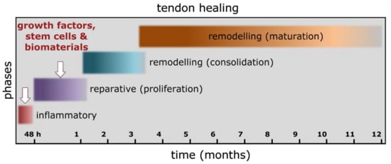 Overview of the tendon repair process in humans. The healing of ruptured tendons passes through three phases with distinctive cellular and molecular cascades. Their duration depends on the location and severity of the injury. During the first two stages (indicated by white arrows), growth factors, stem cells or biomaterials are implemented. Reproduced with permission from [35]. Copyright 2015. Elsevier.