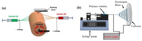 A schematic diagram of the electrospinning process where a rotating drum (a) or a static collector (b) was used for collecting aligned or random fibers.