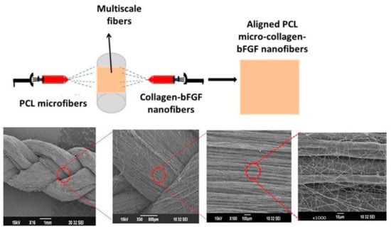 The fabrication and the fibrous structure of a multiscale electrospun fibrous scaffold. Reproduced with permission from [56]. Copyright 2019. American Chemical Society.