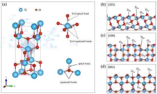 (a) Structure of bulk anatase with TiO6 octahedron and O3C environment. (b–d) Three terminations of anatase-based surfaces with the coordination of surface atoms indicated.