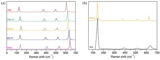 Figure 2a displays the theoretical Raman spectra of anatase obtained with different Hamiltonians. Maschio et al. [] showed that the calculated intensities are sensitive to the choice of the basis set (and less so to the exchange–correlation functional); however, in our case, the relative peak intensities were rather robust with respect to the computational setting. Nonetheless, with a standard calculation, the theoretical intensities did not match the experimental data []. We used the temperature and laser correction for intensities, as implemented in CRYSTAL17, and the relative intensities agree much better with the experimental data (Figure 2b).
