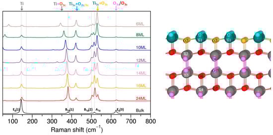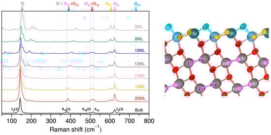 Evolution of Raman spectra for (001) termination with increasing slab thickness. Spectra includes temperature correction for the intensities. The schematic model of the “symmetric” (001) termination shows different types of Ti and O atoms with their specific labels and coloring for Raman peak assignments.