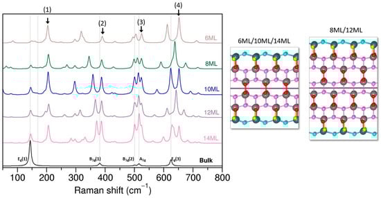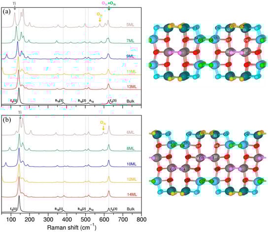 The peaks associated with the Eg(3) mode exhibit a more complex behavior. Depending on the number of layers in the slab, either one (8 ML/12 ML) or two (6 ML/10 ML/14 ML) intense peaks can be identified in the frequency range between 600 and 700 cm−1. Among these, the peak at approximately 654 cm−1, present for -6, 10, and 14 ML (marked by arrow number (4)), remains relatively stable across slabs with different thicknesses. Our analysis using CRYSPLOT revealed that this peak is associated with the collective motion of oxygen network, mainly involving surface O2c atoms. In fact, a similar type of motion with similar frequency was also observed in the 8 and 12 ML slabs, with significantly lower intensity. It appears that the differences in intensity for this mode might be attributed to the particular geometry of slabs. As schematically illustrated in Figure 5, slabs with 6, 10, and 14 ML are symmetric with respect to a mirror plane, while for 8 and 12 ML slabs, this symmetry is absent, which in turn potentially affects dipole moments and the polarization in the structures. The remaining peaks around 625 cm−1 are attributed to O atoms from the inner layers of the slabs, and the intensity of these peaks increases with slab thickness. The intensity of the Eg(3) mode dominates the spectra, which differs from the case of the symmetric slab or the experimental spectra. The intensity of this mode appears to gradually decrease for the 14 ML slab, and may further decrease with increased slab thickness. However, attempts to perform structural optimizations for thicker slabs were unsuccessful, and it is not possible to make clear predictions at this point.