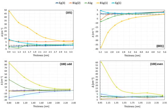 The Eg(3) mode at ~625 cm−1 is ascribed to the Ti–O stretching vibration, which, in (100) slabs, originates from the movement of O3c (pink and green) atoms in a plane parallel to the surface; however, the contribution of each oxygen type depends on the slab “parity” and the position of atoms within the slab. Visualization of vibrational modes for 11 ML and 12 ML slabs is presented in the Supplementary Materials, and illustrates the differences in O3c (pink and green) contribution for slabs with “odd” and “even” numbers of layers. A detailed analysis of evolution of each vibration in this region would be cumbersome and probably confusing, thus it should be enough to note that, when the slab thickness increases, the signal from the O3c (pink and green) atoms from the inner layers becomes dominating and approaches bulk Eg(3) frequency. The signal of the O3c atoms (orange) from the surface layer is found at ~577 cm−1 for the 5 ML slab (~596 cm−1 for 6 ML), and shifts to ~591 cm−1 for the 13 ML slab (~592 cm−1 for 14 ML) with decreasing intensity.