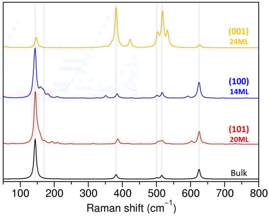 The evolution of the Raman spectra for (100) slabs with “odd” and “even” numbers of layers are presented in Figure 6. As expected, the surface spectra converge to the bulk spectra for slabs at a certain thickness.