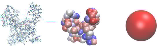 The UA model, previously developed in our lab [,,], includes all major non-covalent contributions to the interactions between the NP and the protein in a simplified way. The solid surface can be represented by a rigid flat (slabs), spherical (NP), or cylindrical (nanotubes) shape. Proteins are considered as rigid-body structures consisting of 20 different amino acids (AA). Each AA is represented by one bead in the UA model, and respective positions of these beads within the protein are fixed. The center of the AA bead is positioned on the AA’s C atom. The CG model of the protein has the same three-dimensional structure and key details as the original all-atom model. However, fewer beads will decrease the dimensionality of the model and result in lower calculation times. This model is illustrated in Figure 1 along with the presentations on all-atom and CG UA. Further coarse-graining is applied to reduce the dimension of modeling the kinetics of the competitive adsorption. The ultra-CG hard-sphere (HS) model for selected proteins is parameterized based on the UA heatmaps.