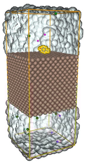 The AA side chain analogues (SCAs are the compounds that result from cutting off the side chains of AAs at the protein backbone and substituting a hydrogen for the carbon) were placed in the center top of the slab. In this work, we calculated the energy for 22 SCAs, including two forms of Histidine, HID, and HIE, depending on the location of the protonation on the nitrogen atom and two forms of glutamic acid, GLU and GAN, negatively charged and neutral, respectively (see the Supporting Materials for more details). The system was solvated using the original form of TIP3 water model []. It was then neutralized by NaCl regarding the charge of the whole system. In the MD calculations, the energy of the system was minimized by Verlet particle-based cut-off scheme using charge groups and steepest gradient method for 1000 steps. Figure 2 shows the simulation box, the Fe-100 slab, and the SCA after the minimization, the water molecules were removed for better visualization. The system was equilibrated under constant pressure 1.0 bar and temperature 300 K conditions (NPT ensemble) using Berendsen weak coupling [] for 1.0 ns. Then, the system was pre-equilibrated for 10 ns in the NVT ensemble. The Nose–Hoover thermostat’s relaxation time constant for the NVT ensemble was 5 ps. The cut-off distance was set to 1.0 nm for the VdW short-range interactions. In the metadynamic-biased simulation, the surface separation distance (SSD) was used as the reaction coordinate. This SSD measures the minimum distance of the COMs of the SCA and the surface atoms along the z axis,