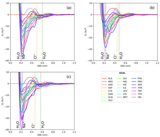 In the adaptive well-tempered metadynamics, the adsorption energy is measured as a function of SSD. These simulations were conducted in the NVT ensemble with the PLUMED (PLUMED2-2.5.1.conda.5) software plugin in GROMACS [,,]. The simulation time was between 500–600 ns for each SCA to obtain the set of short-range one-dimensional PMFs in tabulated form. The bias factor and the time factor were set to 10 and 500 ps, respectively. Every 0.5 ps, the Gaussian was added, the initial height was kJ/mol, and the temperature was kept at 300 K.